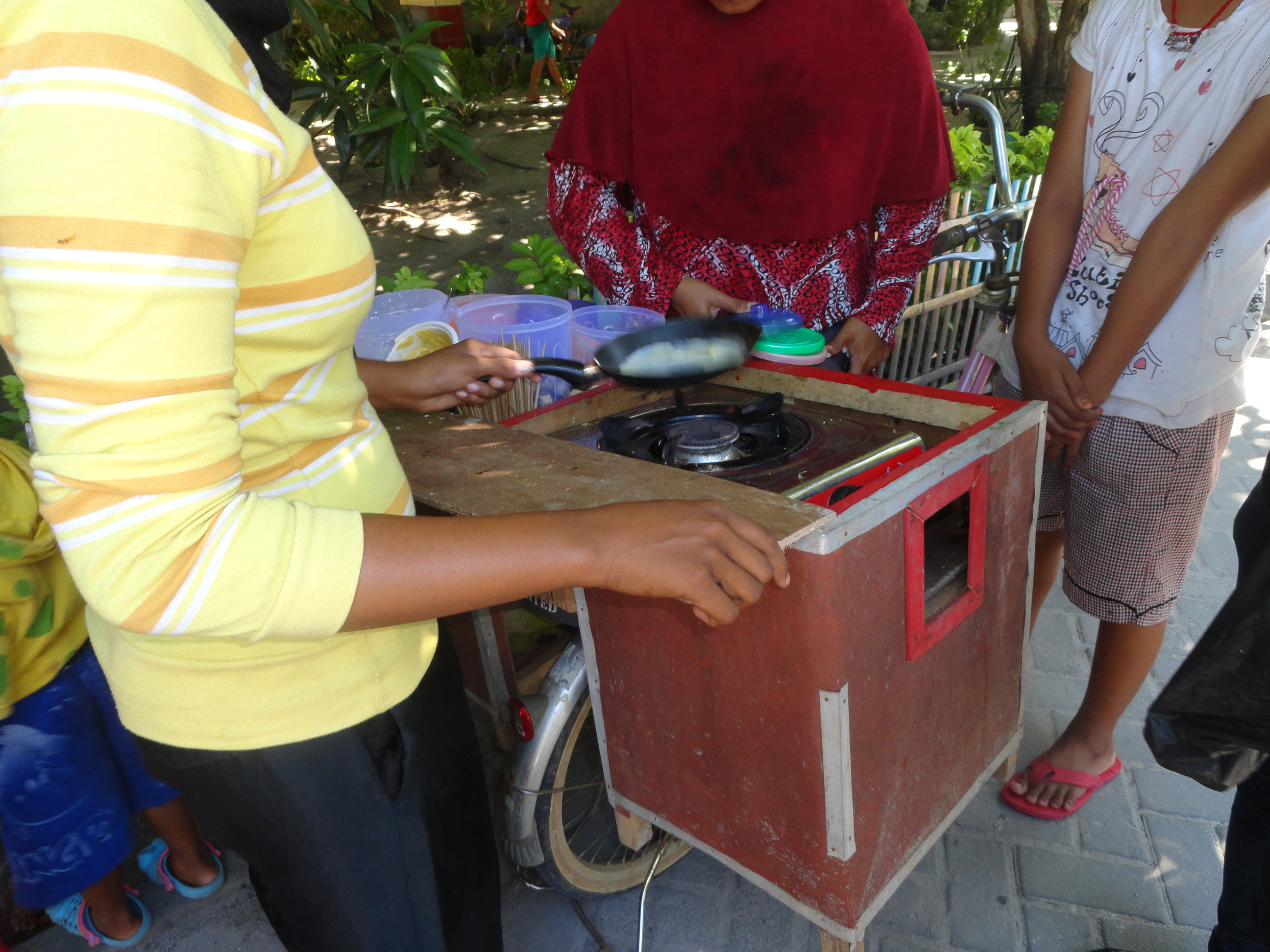 After a quick shower and a short rest, it was time to get back on the bike for a late night ride through the village. We ate at one of the many little family eateries. After putting in our order, we sat at a big wooden table, under a big tree, in front of the moonlit ocean. A welcome breeze was blowing, bring with it the aroma of campfires while keeping the stickiness at bay. Plates of rice, tempe, and vegetables satisfied our hungry bellies before returning to the Virgin Beach to experience the island parties and BBQ’s. The sounds of cooking fish and all kinds music filled the air. It was a completely different feeling compared to just a few hours before.