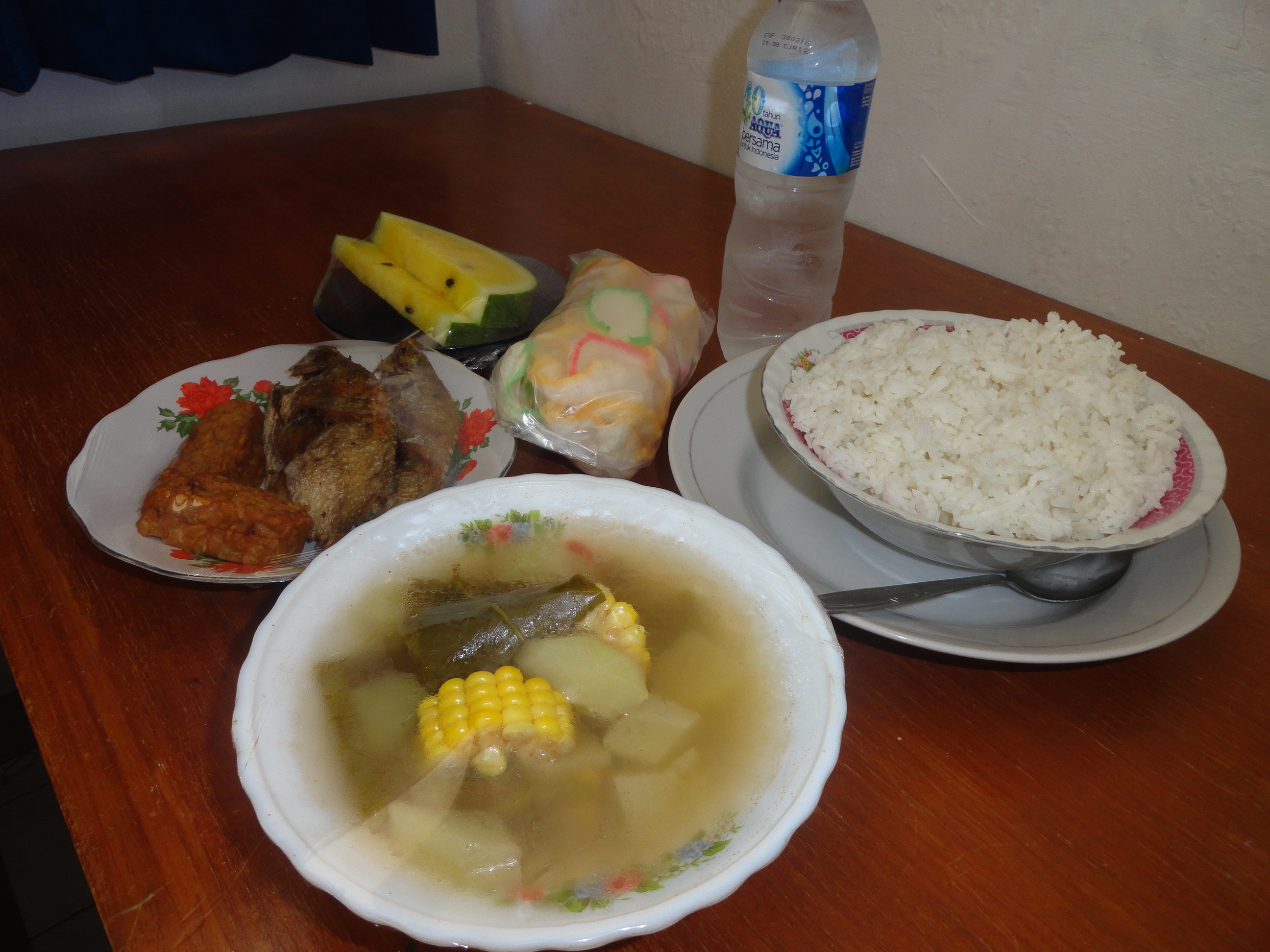 We walked maybe half a mile to our very rustic but cheap accommodation, which was at one end of the island. My new friends and I stopped for some street food of cheesy omelets on a stick before checking into our rooms. Then for about $2 you could have lunch brought to you, and I was shocked at how much food was included!