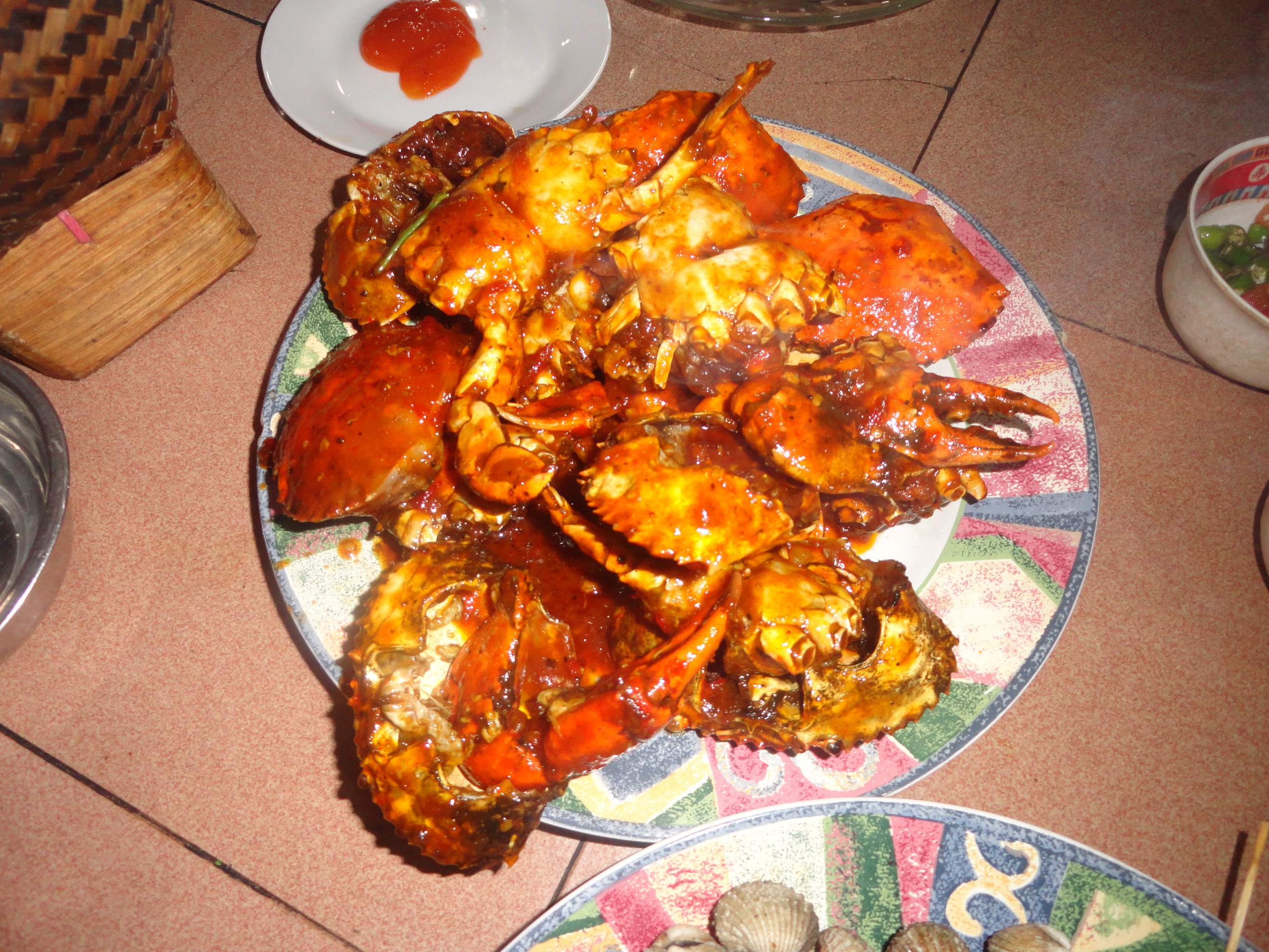 Back at the marina we caught a ride to the fish market area. As we rode along I saw wheelbarrows full of baby sharks, stingrays and types of fish I couldn’t identify. The smell was terrible, but I’ve never seen anything like it. We found a food stall that looked inviting and we quickly ordered kilos of various fresh catches. There were clams, crab and some common fish that I didn’t get the name of, in addition to salad, rice, shrimp and otak otak, (some kind of fish paste, put into banana leaves and cooked over a fire, and then served with a mild sambal, or hot sauce).