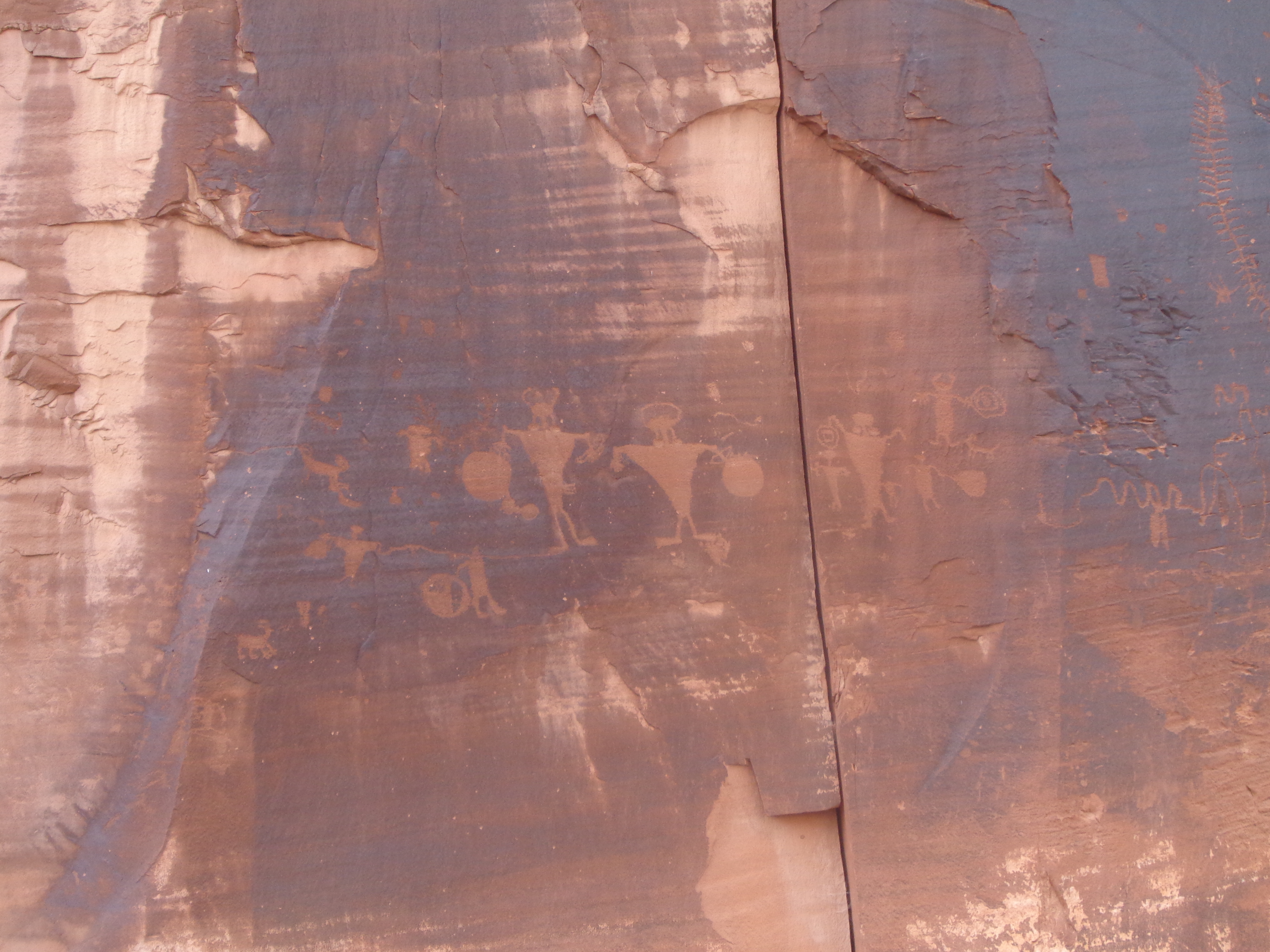 On the way back to Moab, you’ll pass a road with sheer rock cliffs that many try rock climbing on. Just past the rock climbers is a long section of rock with a bunch of petroglyphs. It’s amazing to see the work of people about 10,000 years before our time, but the writing is faint and could be easily overlooked.