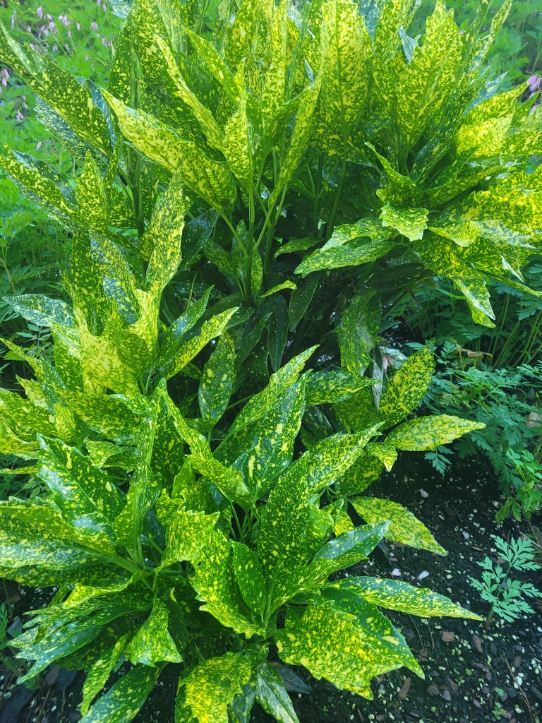 Gold Dust Aucuba is a fairly large plant that grows 4-6 feet high and wide when mature. In an area with so many different green plants, adding these dappled leaves is a nice splash of color. The tag said this was an evergreen…so we’ll see what happens over the fall and winter!