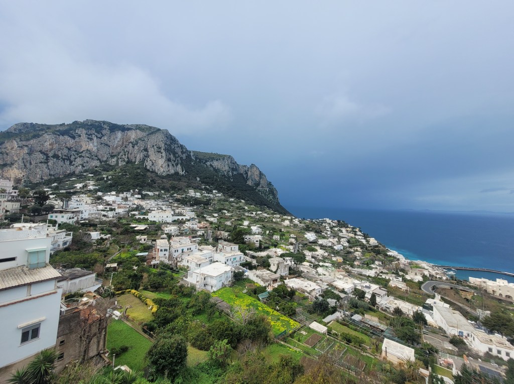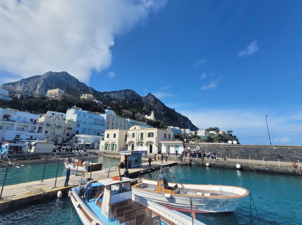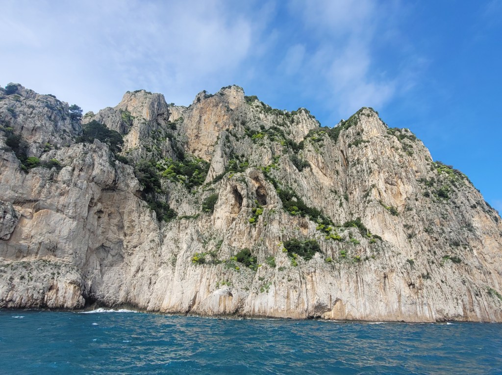 The boat ride was about 50 minutes south to the island of Capri. Although it was safe to travel, the ride was very choppy. That was fun for a while…until it wasn’t anymore. The crew came through with barf bags and as they predicted, many passengers got sick before we reached the Capri dock. Luckily, once we were on solid ground and could feel the fresh air on our faces, everyone instantly started feeling better. We only had a few minutes to ourselves before we hopped onto the sight-seeing boat that would take us around the Northeast corner of the island to show us the beautiful rock formations on that part of the coast before returning to the main dock. We stayed on the boat’s top deck where we could feel the sun and wind on our faces, making us feel so much better.